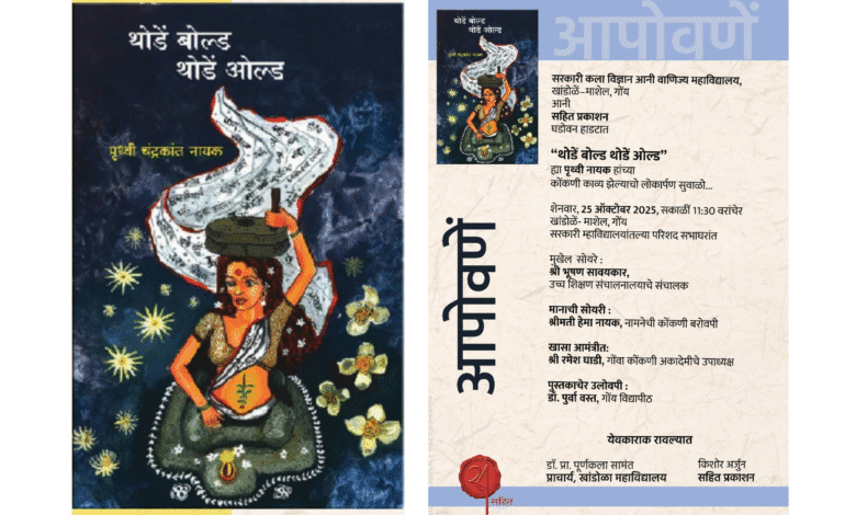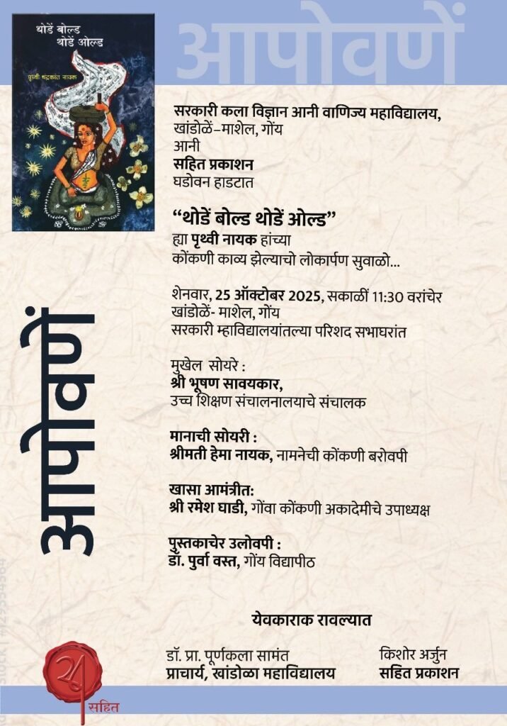 खांडोळा-माशेल येथील शासकीय कला, विज्ञान आणि वाणिज्य महाविद्यालय आणि सहित प्रकाशन संयुक्त विद्यमाने तरुण कवयित्री पृथ्वी नायक यांनी लिहिलेल्या ‘थोडें बोल्ड थोडें ओल्ड’ या कोंकणी काव्यसंग्रहाचे प्रकाशन, गुरुवार, 25 ऑक्टोबर २०२५ रोजी सकाळी ११:३० वाजता महाविद्यालयाच्या सेमिनार हॉलमध्ये आयोजित करण्यात आले आहे.